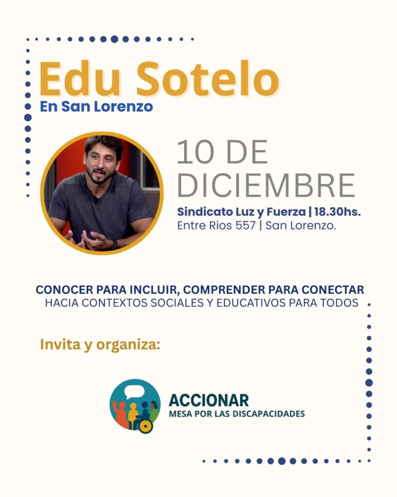 Durante la entrevista, la referente destacó el trabajo de Accionar, la mesa local por la discapacidad, y adelantó una actividad muy esperada: la charla–conversatorio de Eduardo Sotelo, especialista en autismo y referente en inclusión, que se dictará el 10 de diciembre a las 18:30 en el Sindicato de Luz y Fuerza (Entre Ríos 557, San Lorenzo). La propuesta es gratuita, con inscripción previa, aunque quienes no lleguen a anotarse podrán asistir de igual manera si quedan lugares disponibles.
