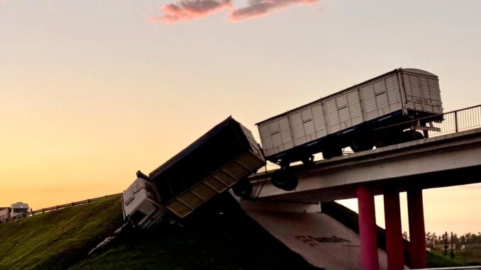 El hecho ocurrió alrededor de las 2:30. Por causas que se investigan, el conductor de un camión perdió el control del vehículo, produjo un despiste y posterior vuelco, quedando el rodado suspendido desde el puente.