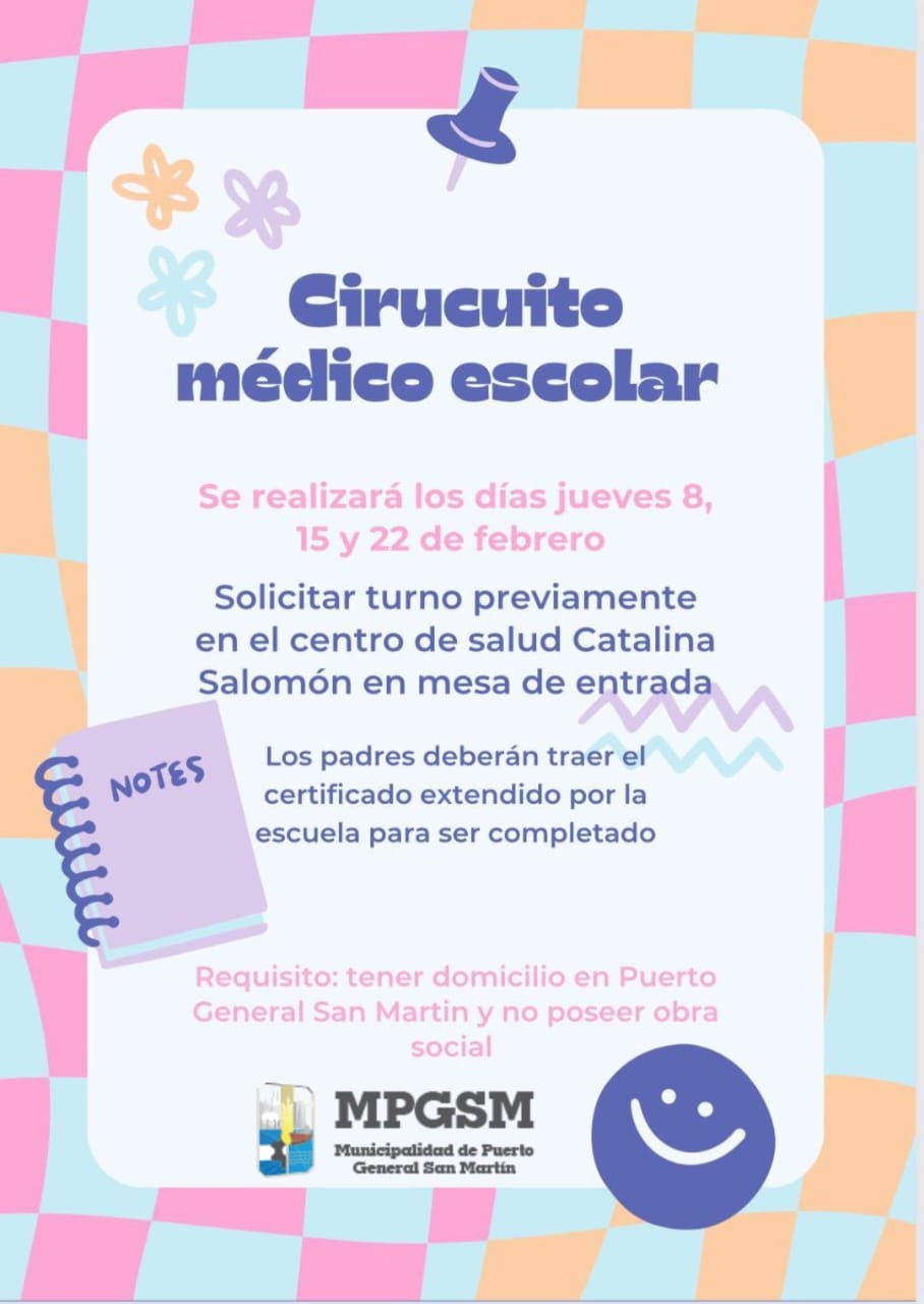 ️La secretaría de Salud municipal informa que los días jueves 8, 15 y 22 de febrero se realizará en el centro de salud Catalina Salomón el CIRCUITO MÉDICO ESCOLAR, es decir todos los exámenes correspondientes pedido por las escuelas para relleno de certificado médico.