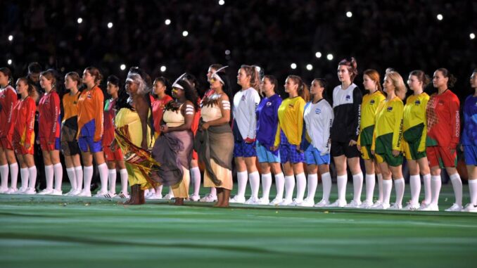 Una vez finalizada la fiesta inaugural con los fuegos artificiales se prendieron las luces del estadio, entró el trofeo que recorrió los 32 países que juegan este Mundial y se desplegaron las banderas de la FIFA Women’s World Cup, de Nueva Zelanda y Noruega, de la FIFA y de una de sus propuestas «Unidos por la inclusión».