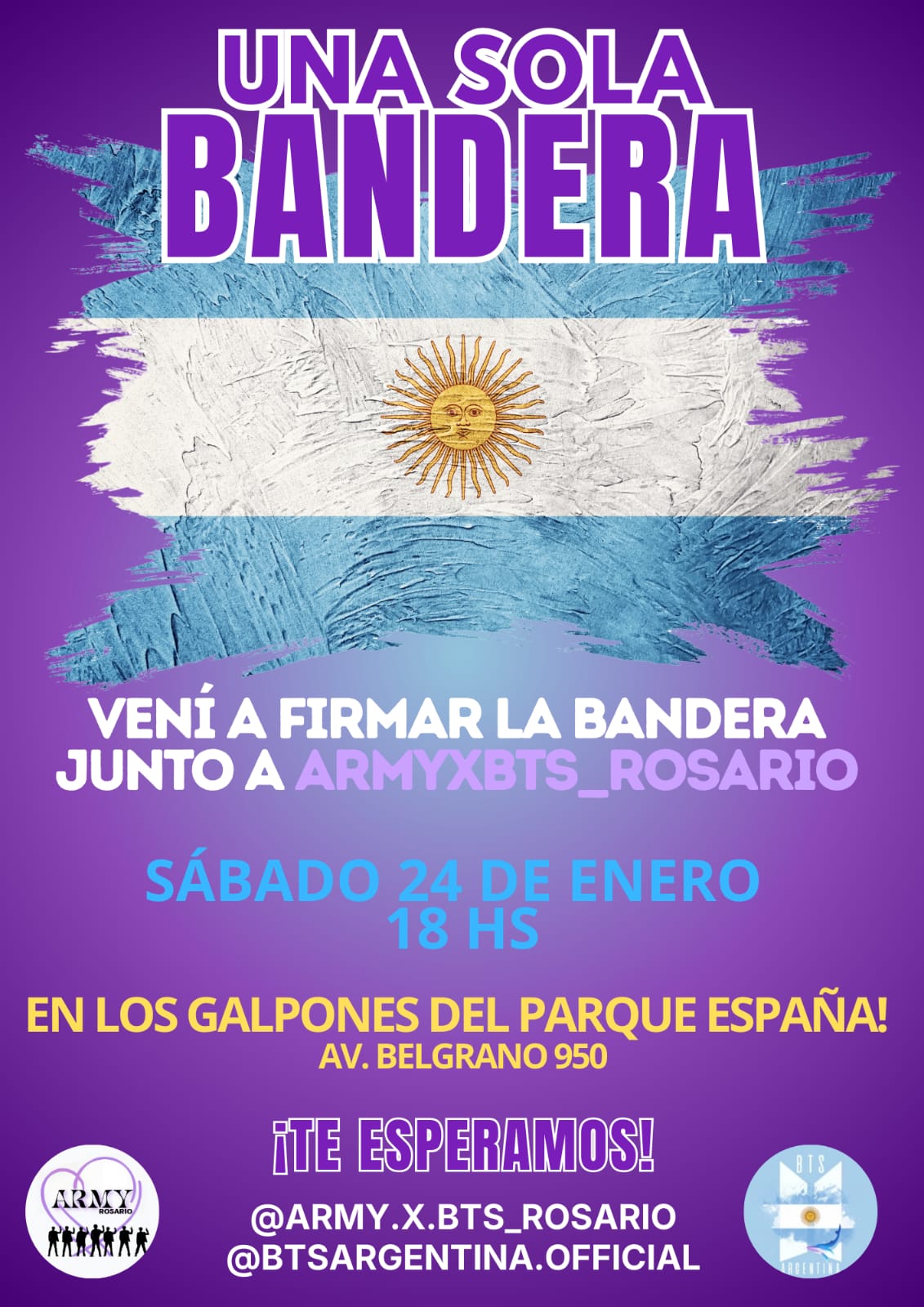 Este sábado 24 de enero a las 18, las ARMYs rosarinas y de la región se encontrarán en los Galpones del Parque España para participar del banderazo, una acción profundamente simbólica: firmar la bandera argentina que representará a la ciudad y que luego será unida a las banderas de todo el país.