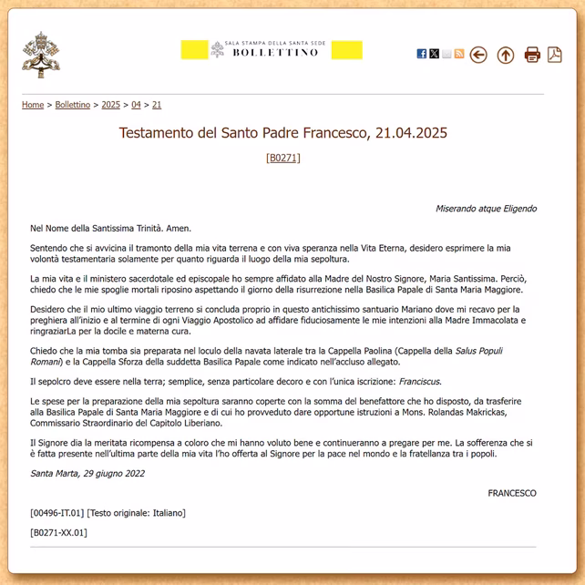 El testamento del Papa Francisco, fallecido este lunes a los 88 años a causa de un ictus cerebral, fue hecho público en las últimas horas y revela su deseo de ser enterrado en la Basílica Papal de Santa María la Mayor, en Roma, en una tumba sencilla y sin decoraciones.