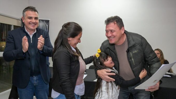 En compañía del secretario Alejandro Cabral, el intendente Leonardo Raimundo expresó: “Es una alegría grande estar hoy aquí dando este gran paso adelante, porque ustedes son gente trabajadora, decente, que hoy accede a su escritura, manifestación jurídica de que uno es dueño del lugar donde vive”.