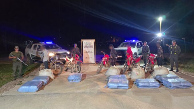 El procedimiento fue realizado por personal del Escuadrón 19 “Ingeniero Juárez”, durante patrullajes nocturnos, dinámicos y sorpresivos en inmediaciones de la zona conocida como La Rinconada, lindante a una barrera de contención. En ese contexto, los efectivos advirtieron la presencia de cinco motos que circulaban con bultos de grandes dimensiones sujetos en los asientos traseros.
