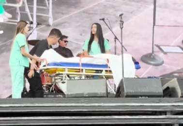 Escoltado por dos asistentes y cubierto con una sábana blanca, mientras sonaban sirenas de ambulancia, el cantante apareció ante la mirada atónita de miles de personas. La sorpresa fue total cuando, ya sobre el escenario, comenzó a entonar “No se llama amor”, desatando la ovación del público.