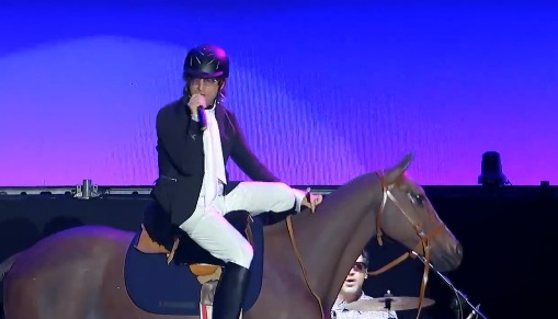 El líder de la banda Turf sorprendió al público al ingresar al escenario montado en un caballo y vestido como jinete, en una puesta en escena teatral que rápidamente se volvió viral entre los fanáticos del festival.