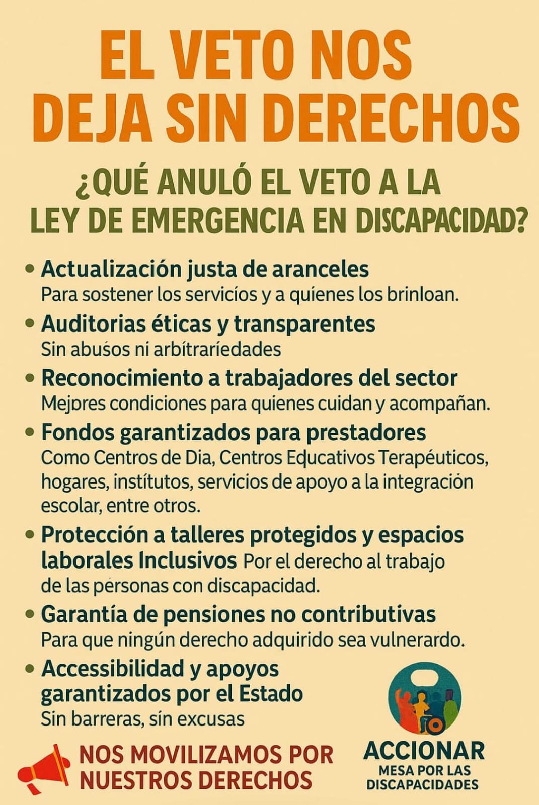 La Ley de Emergencia en Discapacidad, aprobada por el Congreso, planteaba una serie de medidas urgentes para garantizar el acceso a tratamientos, prestaciones, transporte y asistencia para personas con discapacidad en todo el país. Su veto generó un fuerte rechazo en múltiples sectores, que consideran que la norma respondía a necesidades críticas y postergadas.
