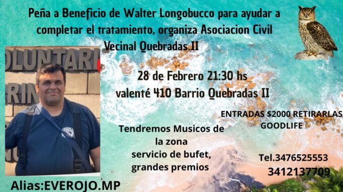 La Asociación Civil Vecinal Quebradas II organiza una peña solidaria con el objetivo de recaudar fondos para el tratamiento médico de Walter Longobucco, integrante de la agrupación de Bomberos Voluntarios de Pueblo Andino.