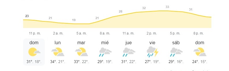 El lunes se mantendrán las mismas condiciones con aumento de los registros térmicos; por la tarde la máxima estará en 34 grados y habrá ráfagas de viento norte a la noche. El martes seguirá el calor con 33 grados