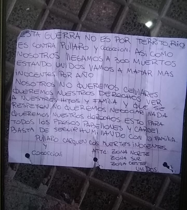 El cartel está destinado al gobernador Maximiliano Pullaro y al Ministro de Seguridad Pablo Cococcioni en respuesta al accionar en la cárcel .