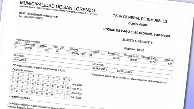 La liquidación se puede gestionar a través de la página de Municipalidad (https://servicios.sanlorenzo.gov.ar/), por medio de home banking o de forma presencial en el Palacio Municipal, con ingreso por cortada Biosca.